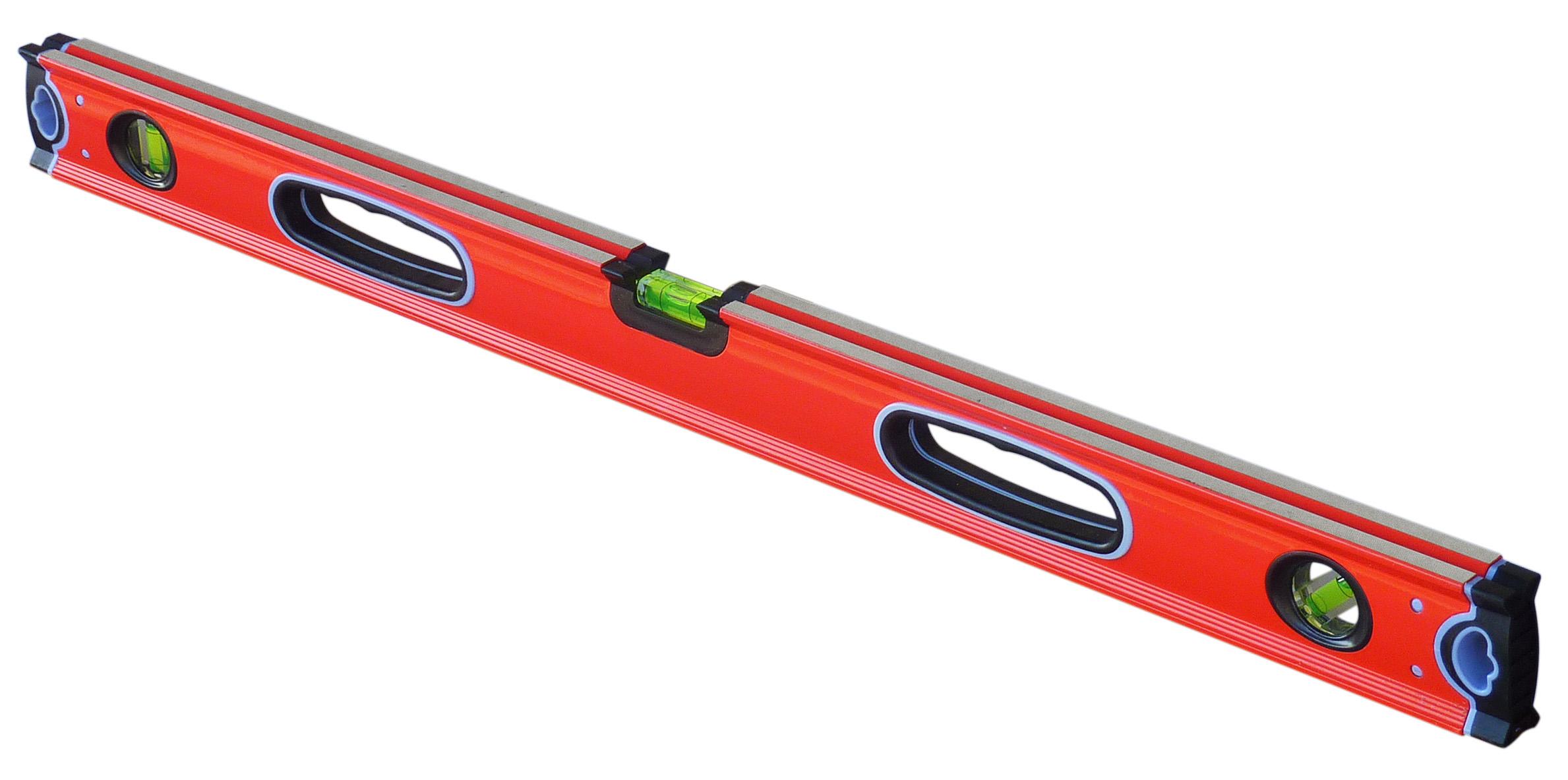 Niveau tubulaire avec poignées ergonomiques. Semelles rectifiées avec rainure idéales pour se positionner sur des tubes. Extrémités avec protection antichocs.
