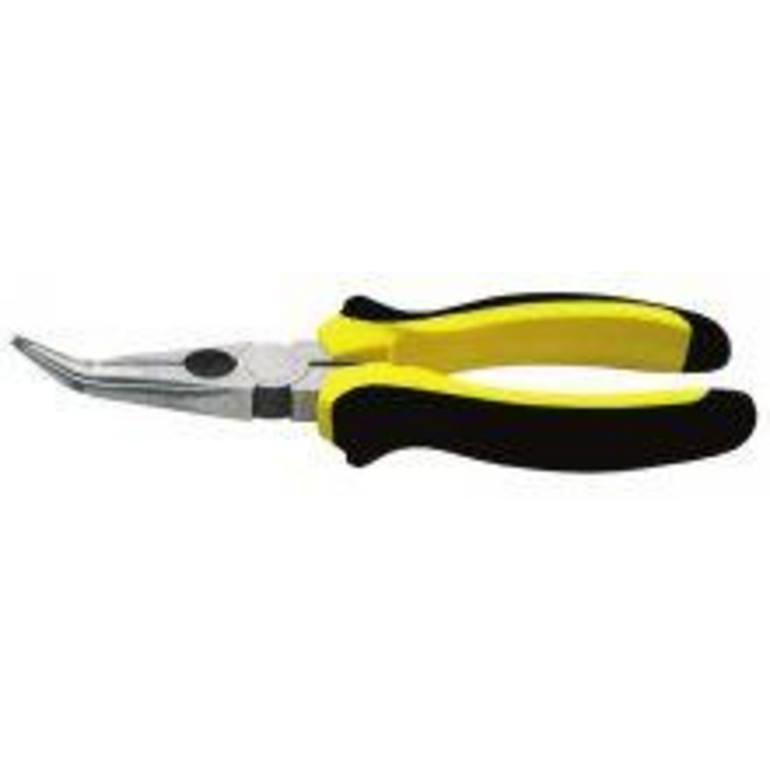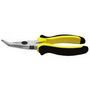 Pince téléphone coudée. Becs coudés demi-ronds + coupe-câble. Pince chrome vanadium, finition satinée, poignées bi-matière ergonomiques.