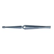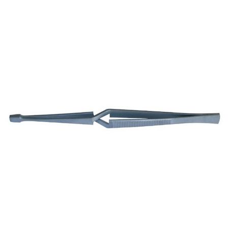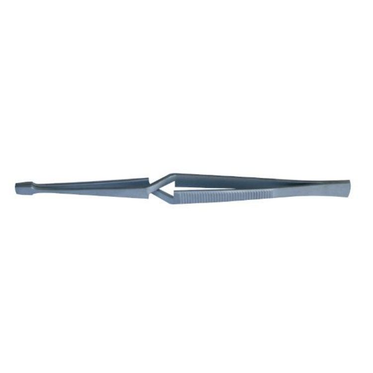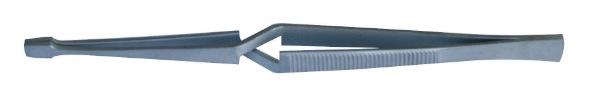 Précelle inox à becs coudés longs, striés. Longueur : 130 mm, poids : 25 g.