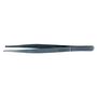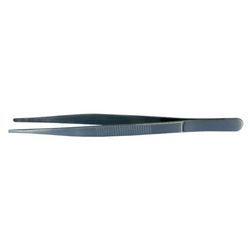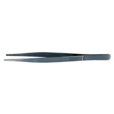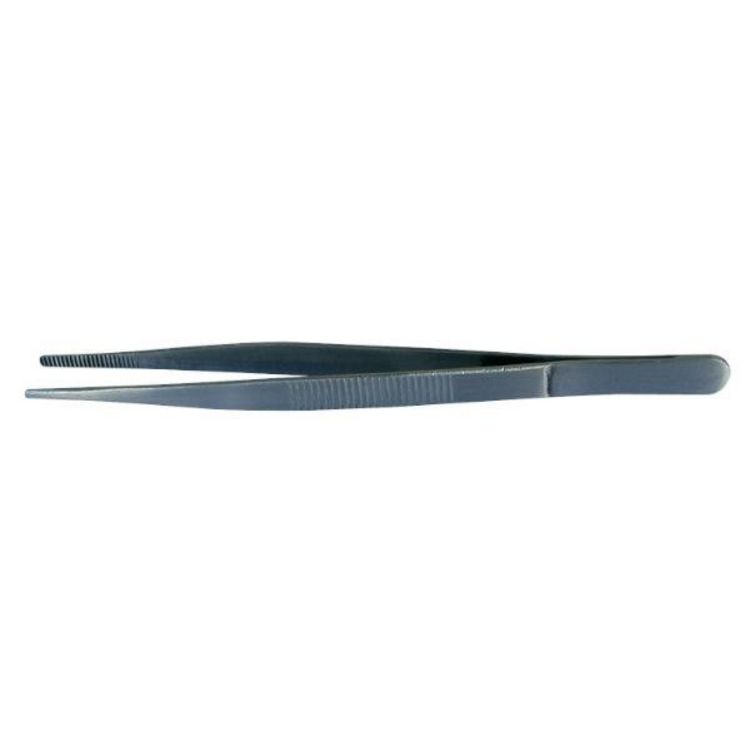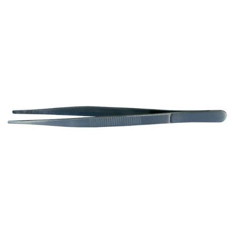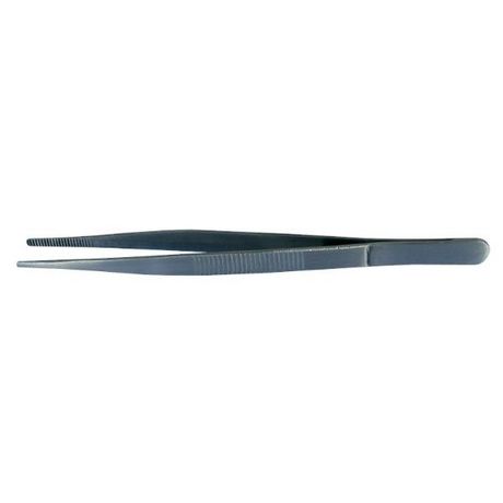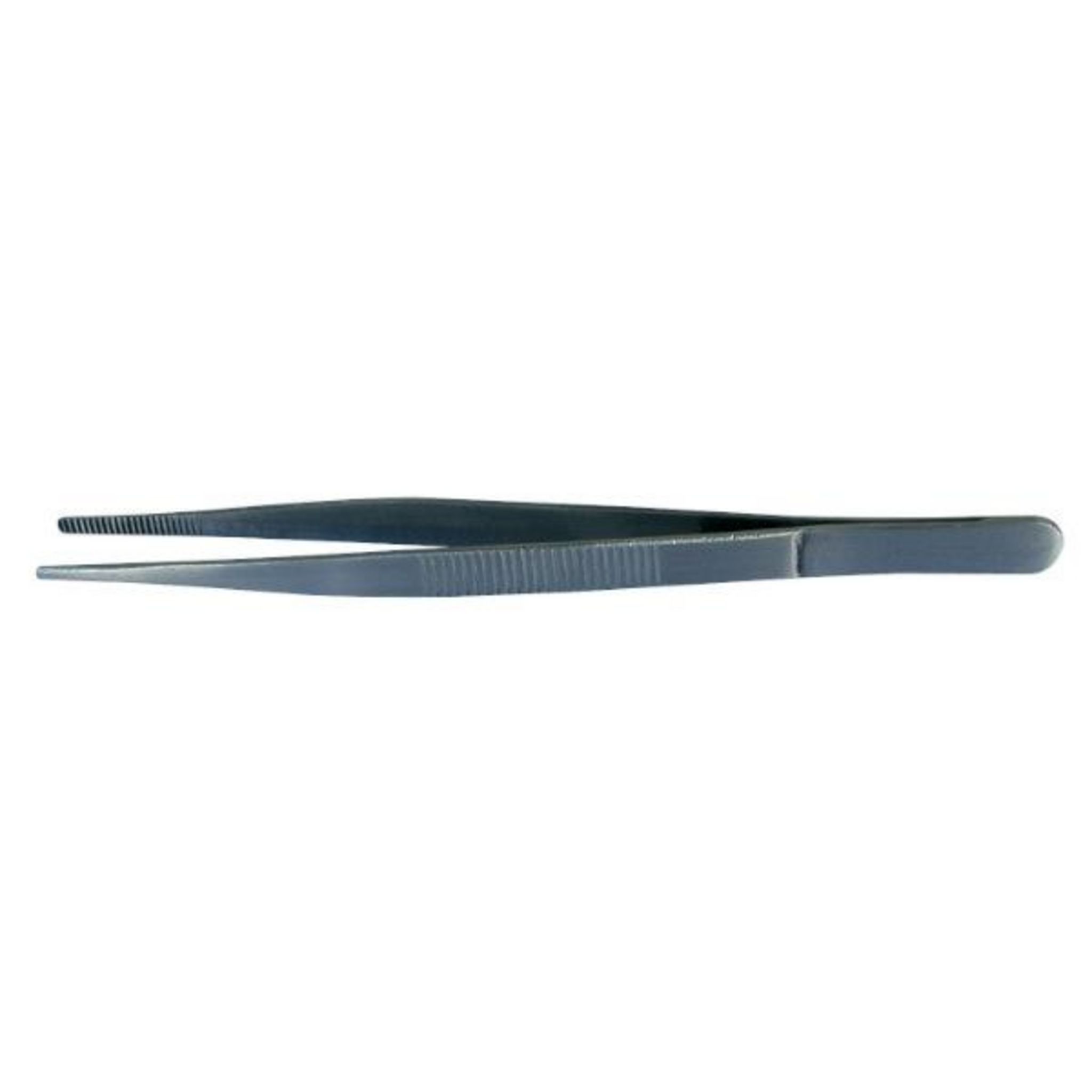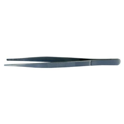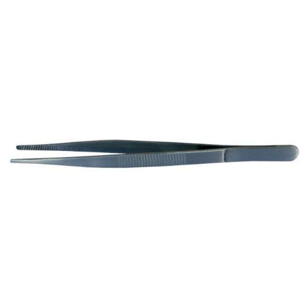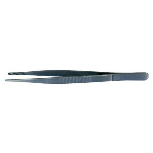 Précelle inox, bec droit, strié, rond. Longueur : 165 mm, poids : 25 g.