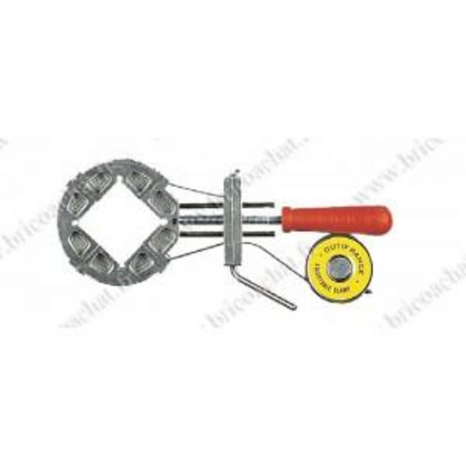 Presse à feuillard. Permet l'assemblage des 4 côtés du cadre. Enrouleur de feuillard.