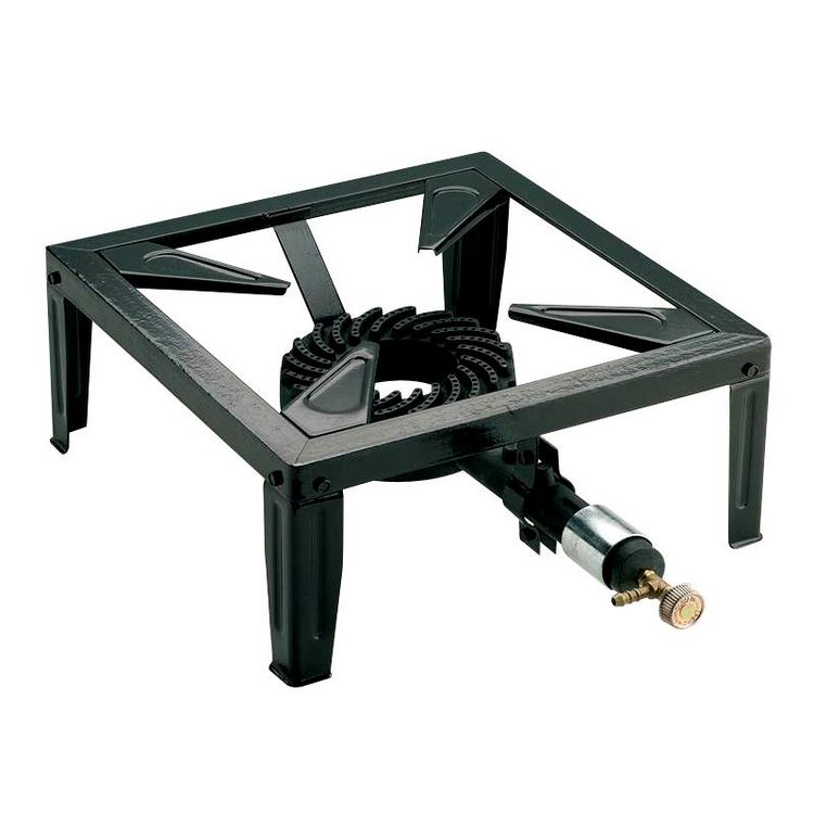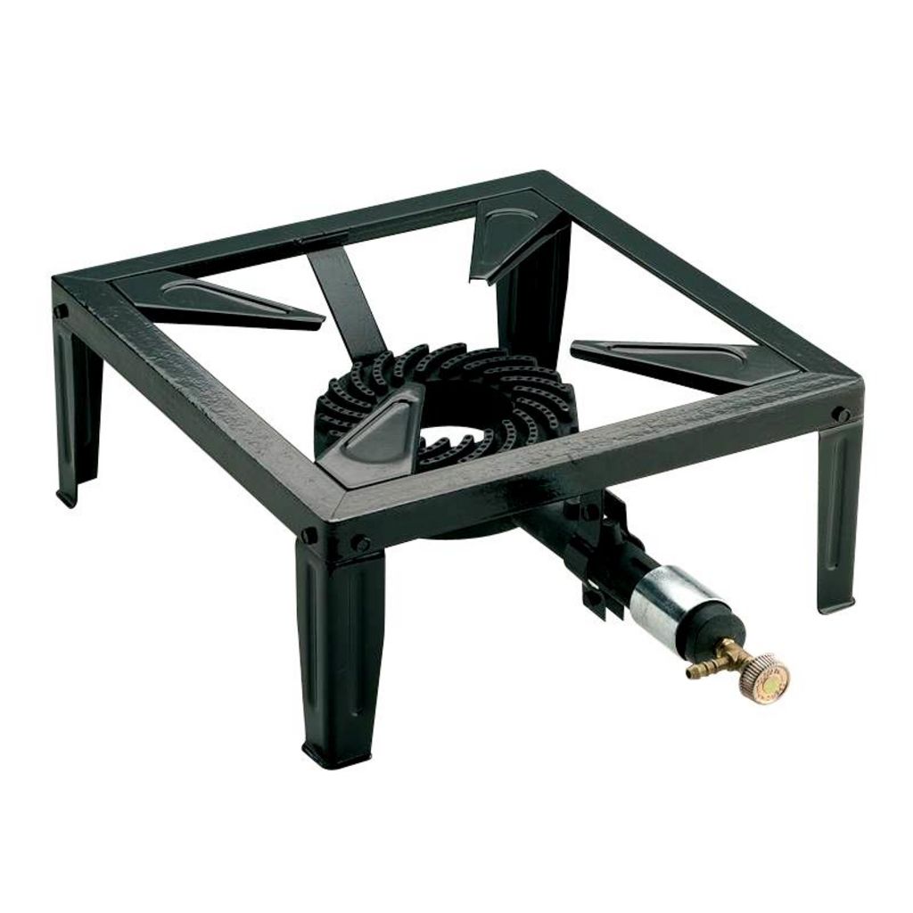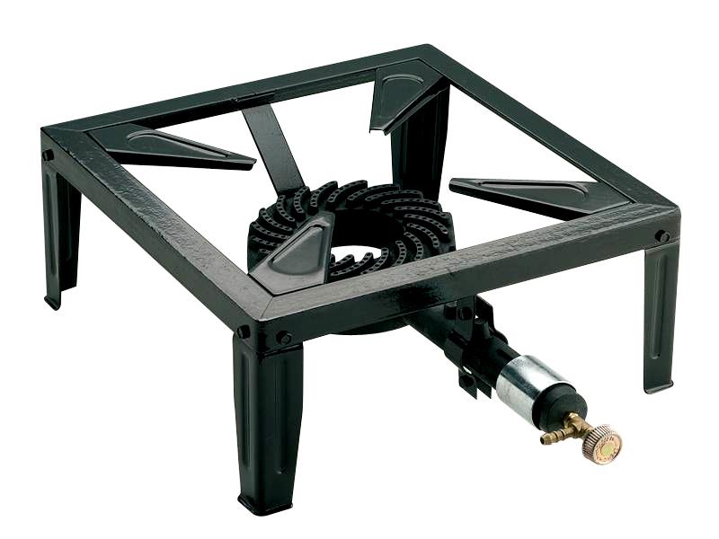 Réchaud de chantier avec corps en fonte et support casserole. Allumage traditionnel. 4 pieds.Diamètre du brûleur : 140 mmConsommation nominale : 544 g/hPuissance : 7,5 KWDimensions : 400 x 400 x 170 mmPoids : 6,25 kg