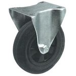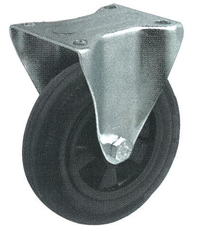 Roulette fixe sans frein. Diamètre / charge : 200 mm / 200 kg, platine : 140 x 110 mm. En polypropylène avec bandage caoutchouc.