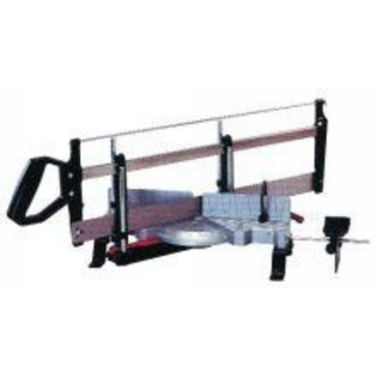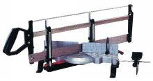 Scie à onglet PROMAN 110. Permet les coupes en double onglet. Préréglage des angles 15°, 22,5°, 30°, 36°, 45° et 90°. Coupes inclinées de 0° à 55°. Livrée avec serre-joints à serrage rapide pour le maintien ferme des pièces à travailler, butée de longueur pour des coupes jusqu'à 1335 mm, et support