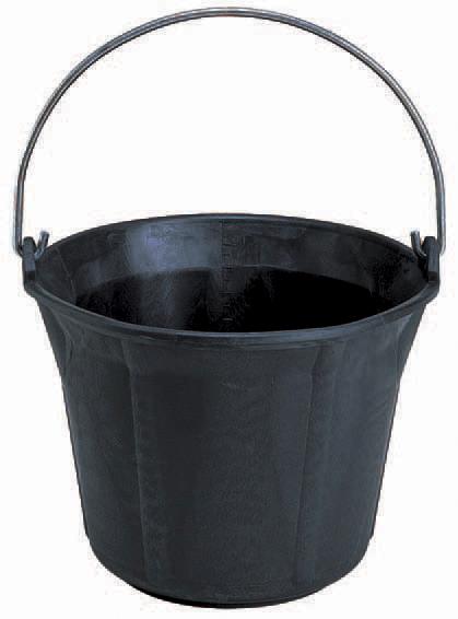 Sceau de maçon en caoutchouc mélangé avec nervures longitudinales, graduation intérieur et anse métallique.Capacité : 11LDiamètre : 300 mm