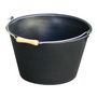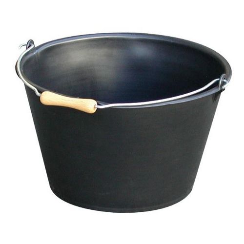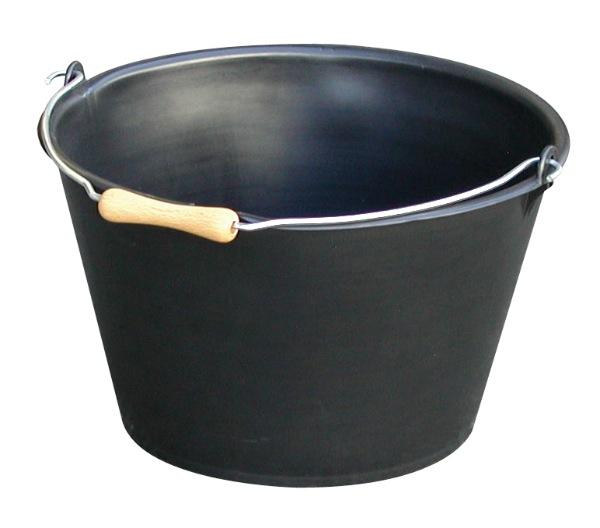 Seau en plastique, anse métallique avec poignée bois, forme large et évasée. Volume : 15,5 L, diamètre : 350 mm.