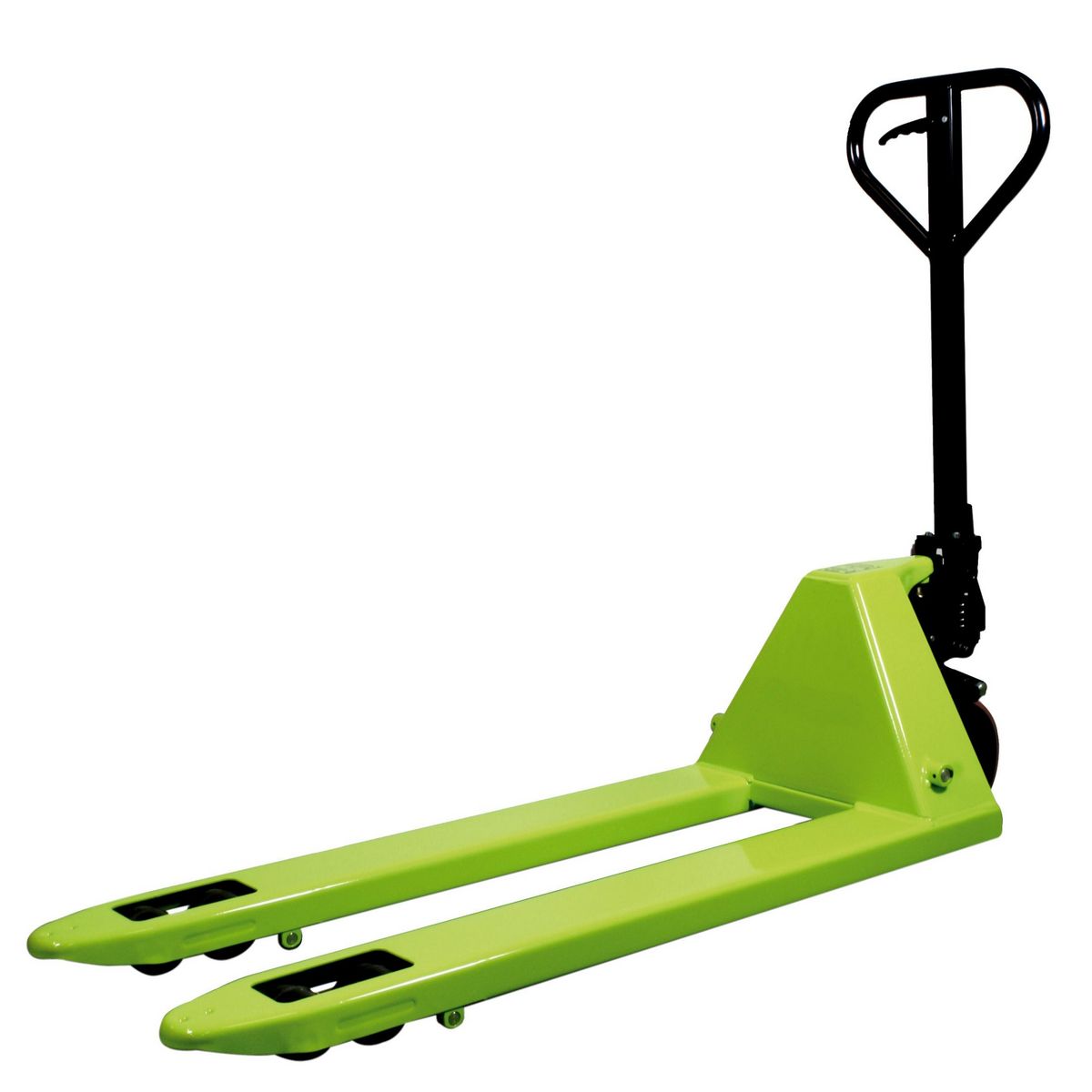Transpalette avec pompe à piston hydraulique bi-étagé (démultiplication).Bogie à double essieu avec roues caoutchouc répartissant la charge.
