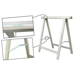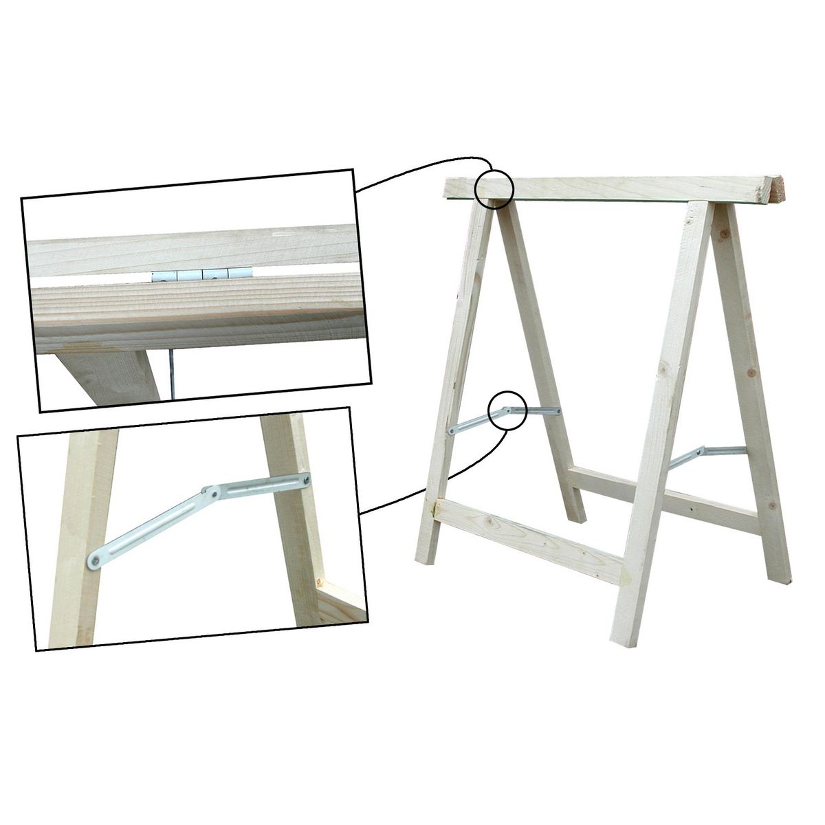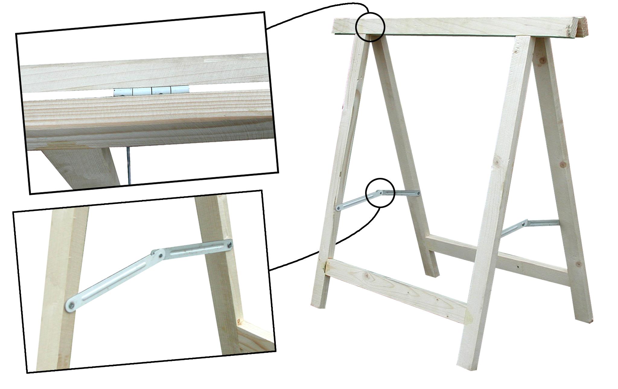 Tréteau pliant avec compas et charnières vissées.