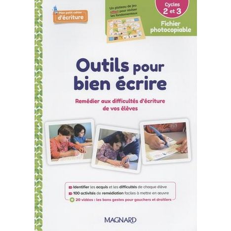 - Une méthode simple et efficace pour remédier aux difficultés d'écriture de vos élèves (cycles 2 et 3) - Un accompagnement pas à pas et illustré par des photographies pour repérer les principales difficultés des élèves - Pour chaque difficulté repérée, une solution ciblée et efficace - Plus de 100 fiches d'activités différenciées (, , ) pour faire progresser les élèves à leur rythme, qu'ils soient gauchers ou droitiers - Un lignage spécifique et évolutif pour amener progressivement les élèves au Seyès - Des activités ludiques pour améliorer le tracé des formes de base et des lettres - Des activités d'entraînement pour gagner en fluidité, acquérir des stratégies de copie et prendre de la vitesse - Une approche bienveillante pour encourager la réussite de tous les élèves - Un plateau de jeu pour réviser les fondamentaux de l'écriture en s'amusant + NUMERIQUE : Des vidéos pour montrer les bons gestes et les bons tracés, et faciliter la mise en oeuvre des activités