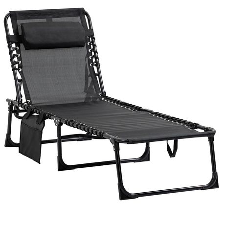 Bain de soleil transat pliable avec poignée - dossier inclinable multi-positions, pochette, tétière - acier époxy lacets élastiques textilène noir