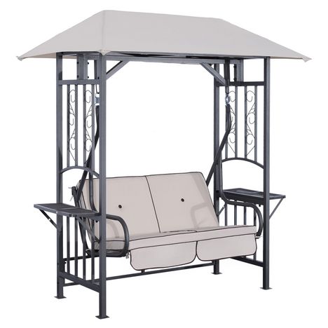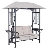 Balancelle de jardin 2 places style colonial grand confort matelas + tablettes supports métal époxy gris foncé polyester gris clair