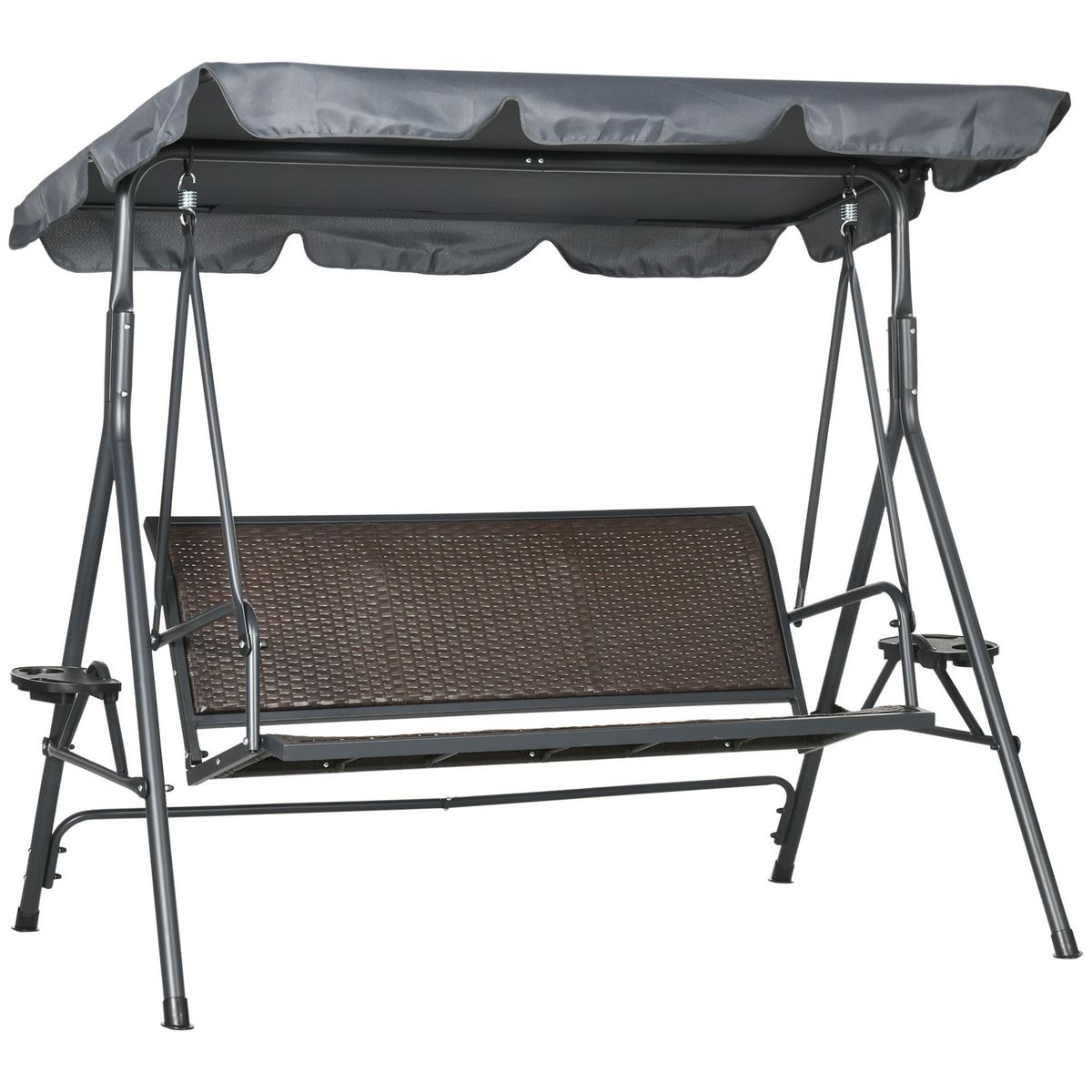Balancelle de jardin 3 places - auvent réglable, plateaux porte-gobelets - résine tressée PE brun acier polyester gris