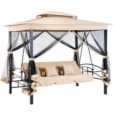 Balancelle de jardin 3 places convertible style colonial grand confort 5 coussins + matelas + moustiquaires inclus 2,56L x 1,72l x 2,48H m marron clair
