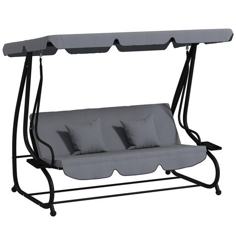 Balancelle de jardin convertible 3 places inclinaison toit réglable 2 tablettes + matelas 2L x 1,2l x 1,64H m métal époxy noir polyester gris