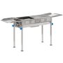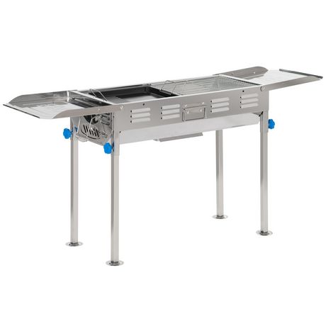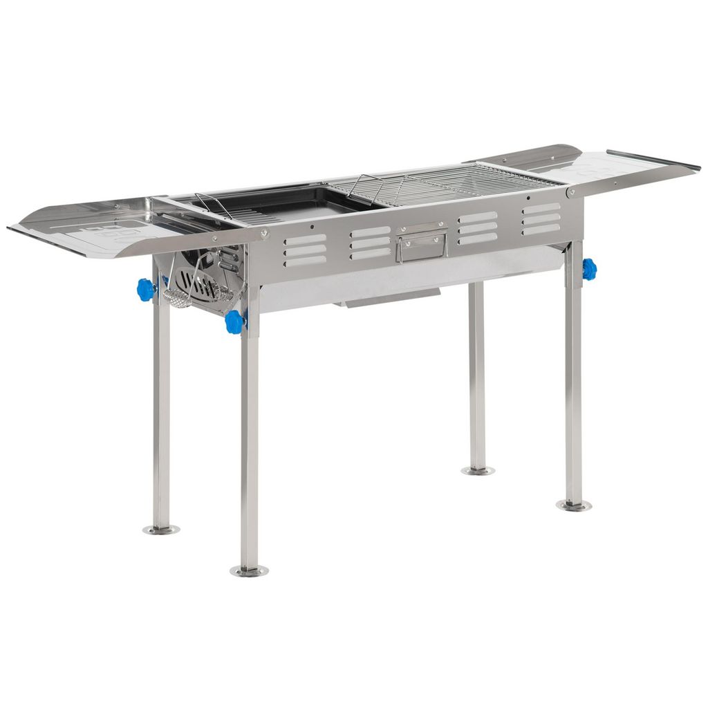 Barbecue à charbon pliable portable réglable BBQ grill sur pied avec tablettes rabattables, grille, plaque teppanyaki, pinces, récupérateur cendres acier inox.