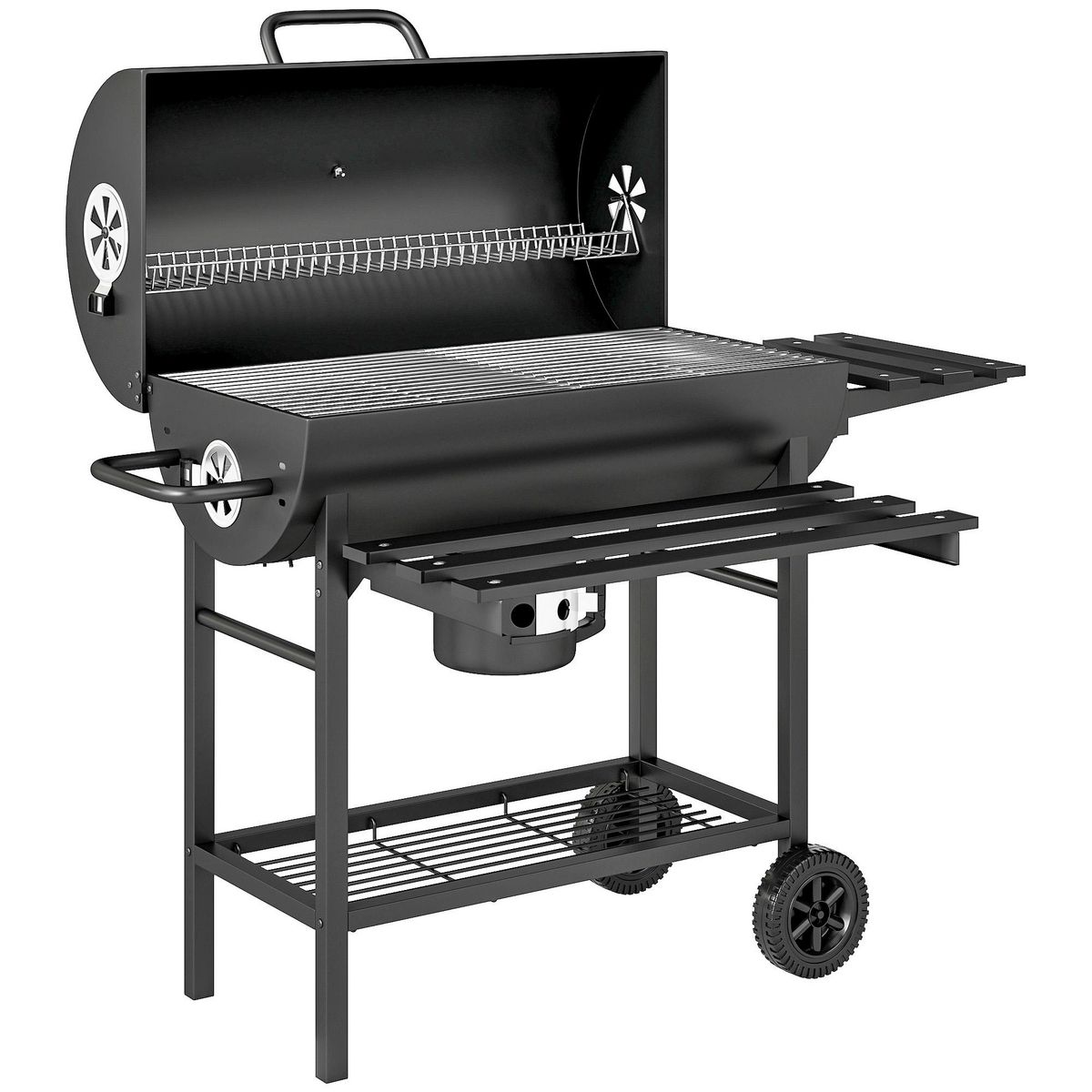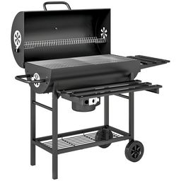 Barbecue charbon de bois avec couvercle 2 roues - 2 tablettes pliables, étagère, thermomètre - acier noir
