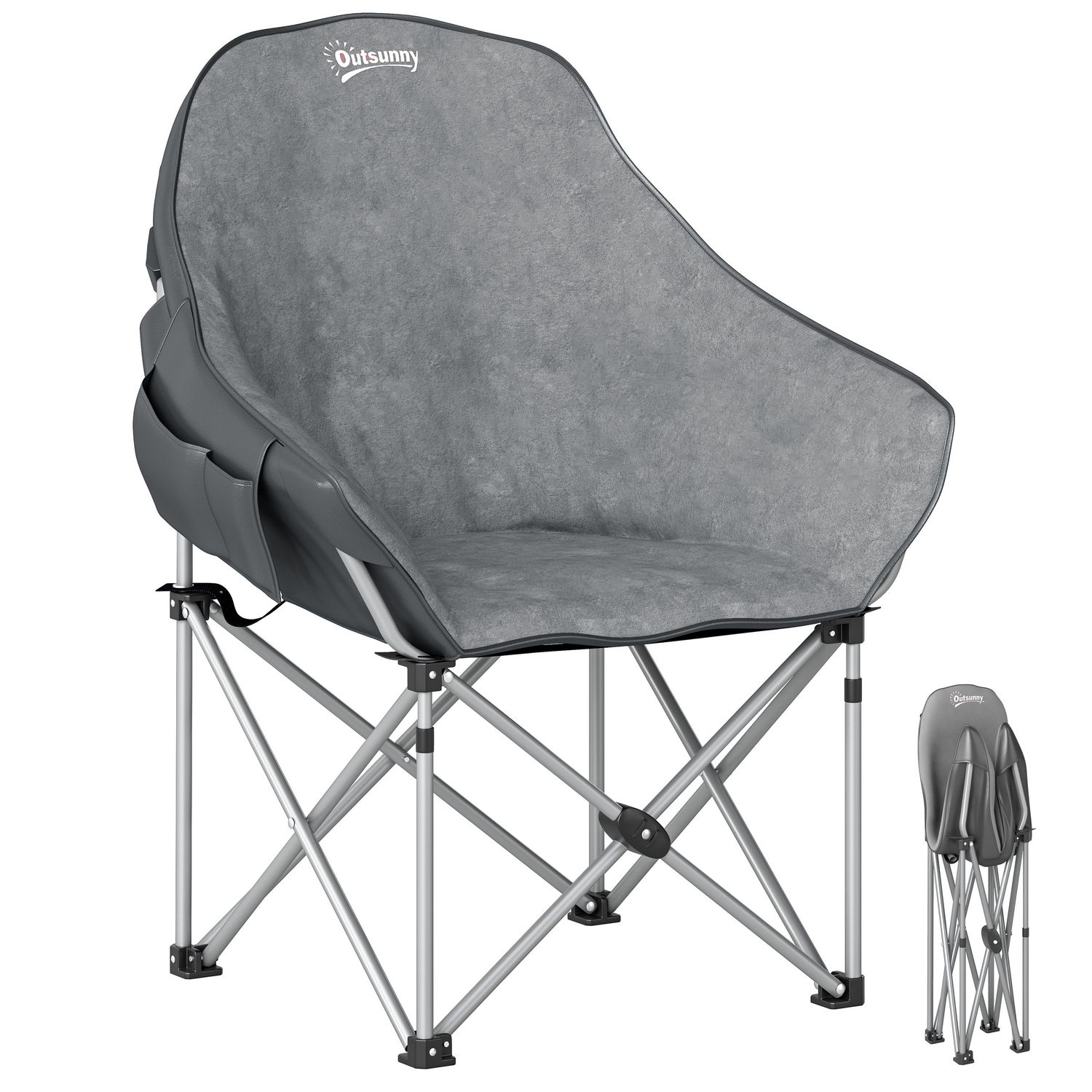 Découvrez la chaise de plage et camping pliable Outsunny, en faux suède avec rembourrage mousse. Cadre métallique résistant, patins antidérapants, elle convient pour camping ou pique-niques. Inclut poches latérales et se plie en format compact, idéale pour toute sortie en plein air.