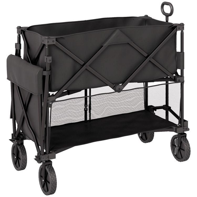 Découvrez le chariot à roulettes pliable Outsunny à double étage: parfait pour le camping ou le jardin. Transportez jusqu'à 205 kg facilement avec son cadre en acier et ses roues tout-terrain. Idéal pour les rassemblements, la pêche ou le jardinage.