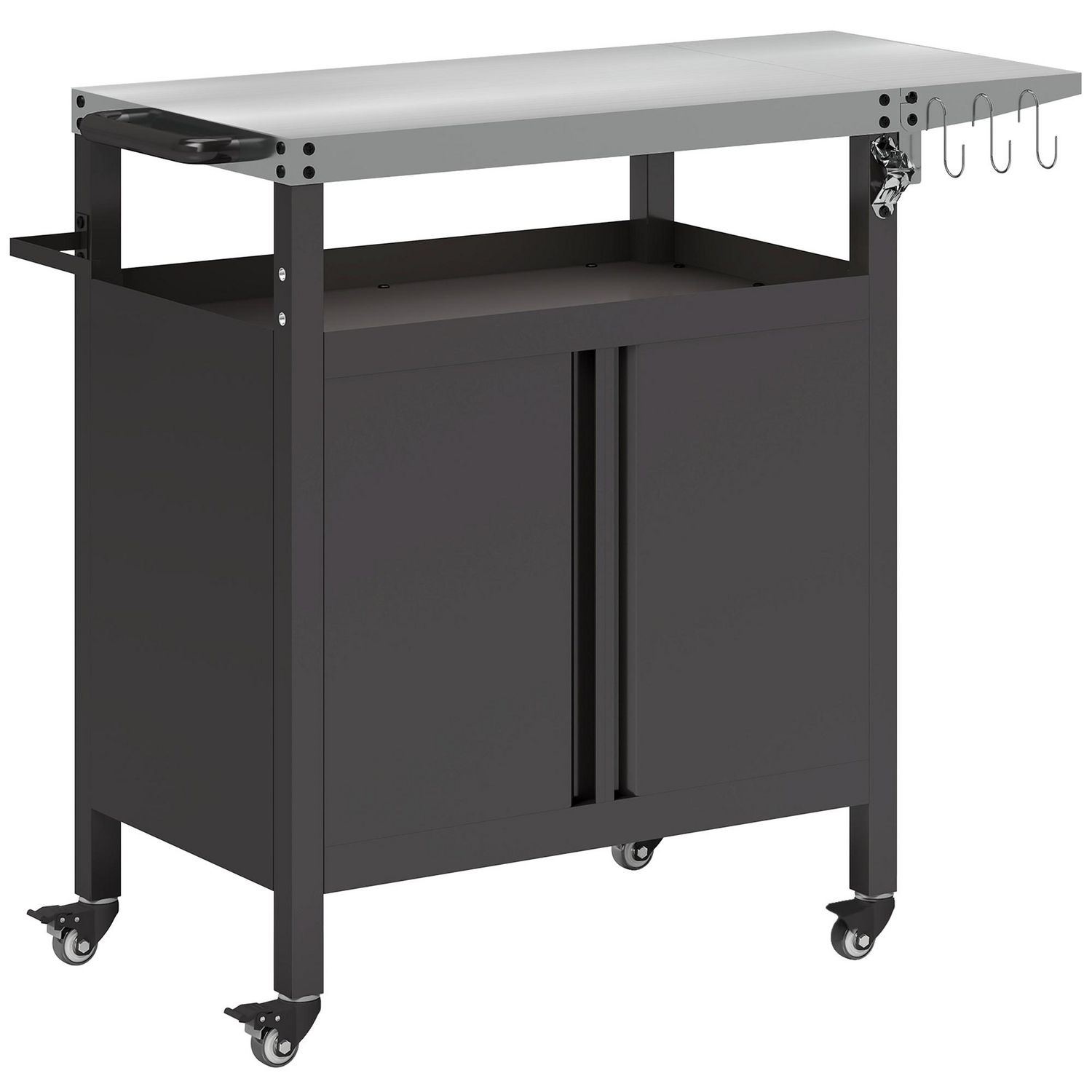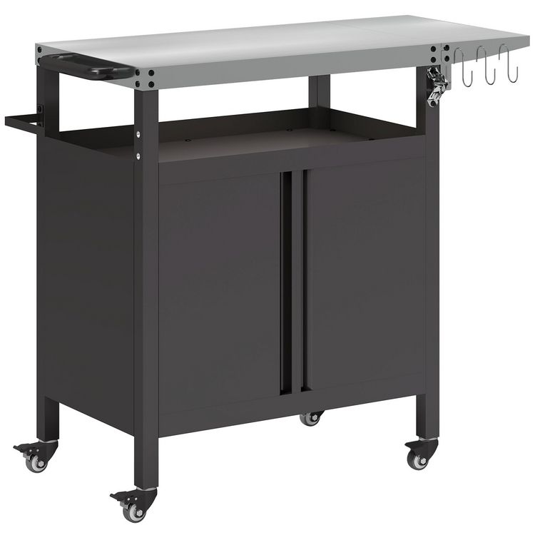 Desserte de jardin desserte plancha barbecue - 2 portes, tablette pliable, 3 crochets - acier noir acier inox
