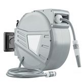 Dévidoir mural enrouleur automatique pivotant 180° tuyau 30 + 2 m avec lance arrosage 2 modes support mural intégré gris clair
