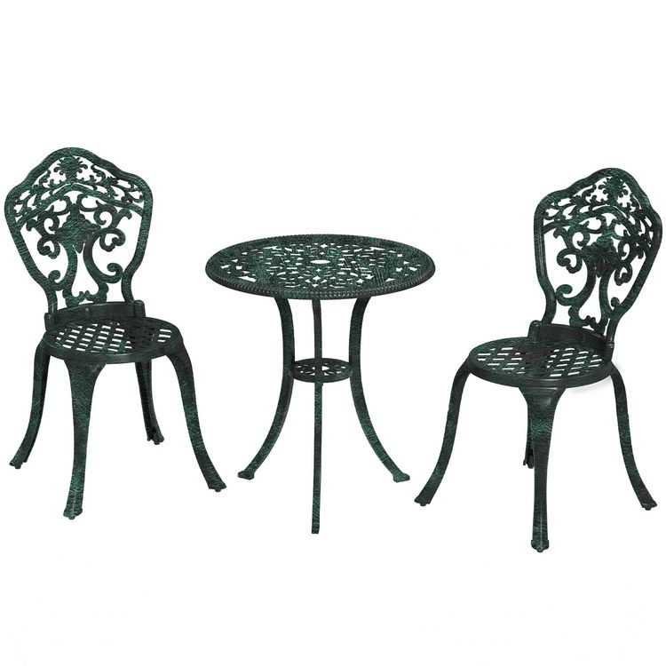 Ensemble bistrot de jardin 2 personnes 3 pièces aluminium aspect fer forgé noir vieilli vert