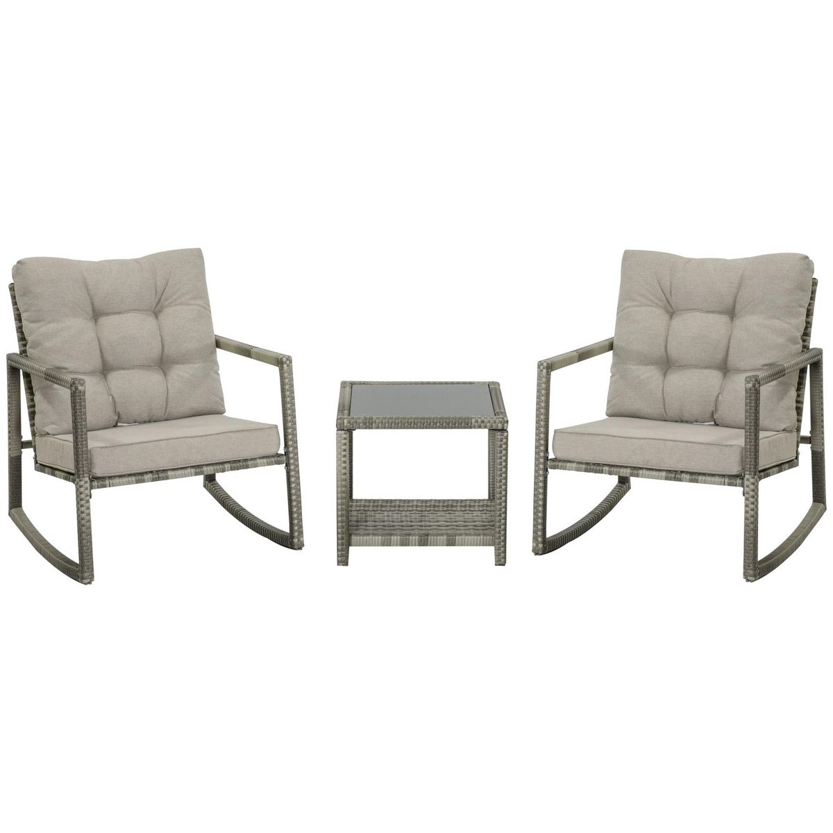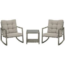 Ensemble de jardin 3 pièces 2 fauteuils à bascule table basse coussins inclus métal époxy résine tressée PE polyester gris