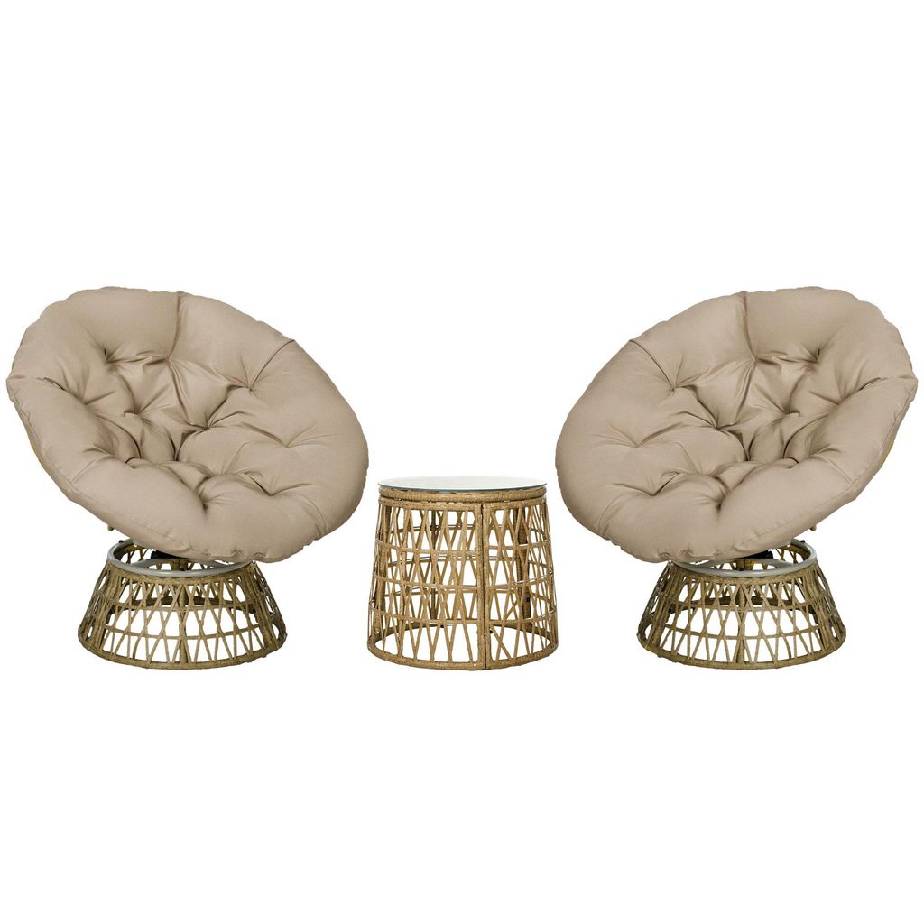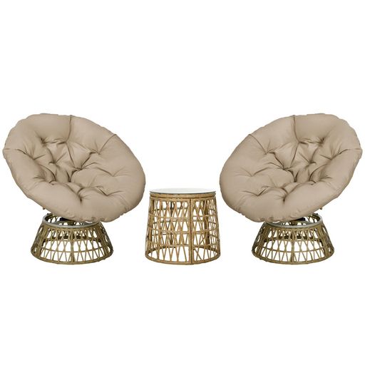 Ce magnifique ensemble salon de jardin avec 2 fauteuils papasan et 1 table basse ajoutera une touche cosy à votre intérieur ou extérieur. Les fauteuils pivotent à 360° et sont équipés d'un grand coussin moelleux, son confort d'assise est inégalable. À adopter de toute urgence ! Vous tomberez facilement sous le charme de ce salon de jardin.