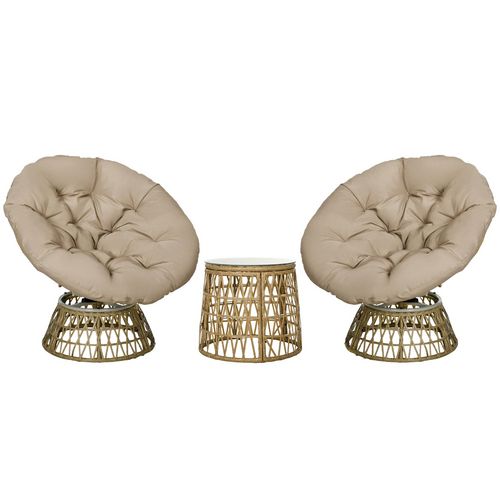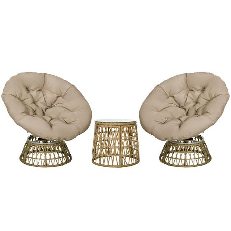 Ce magnifique ensemble salon de jardin avec 2 fauteuils papasan et 1 table basse ajoutera une touche cosy à votre intérieur ou extérieur. Les fauteuils pivotent à 360° et sont équipés d'un grand coussin moelleux, son confort d'assise est inégalable. À adopter de toute urgence ! Vous tomberez facilem