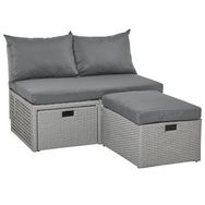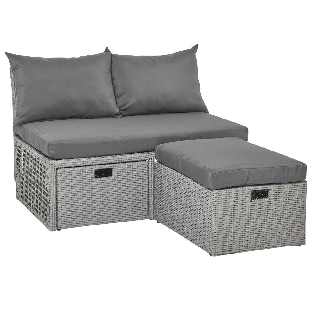 Ensemble salon de jardin 3 places 3 pièces - canapé 2 places, pouf, coffre rangement - 4 coussins inclus - résine tressée imitation rotin gris