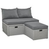 Ce magnifique ensemble salon de jardin 3 places 3 pièces composé d'un canapé 2 places, d'un pouf, d'un coffre de rangement (4 coussins inclus) sera très pratique et confortable pour un usage au quotidien. En effet, le pouf et coffre de rangement sont encastables sous le canapé ce qui vous permettra