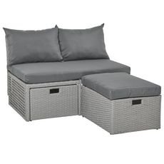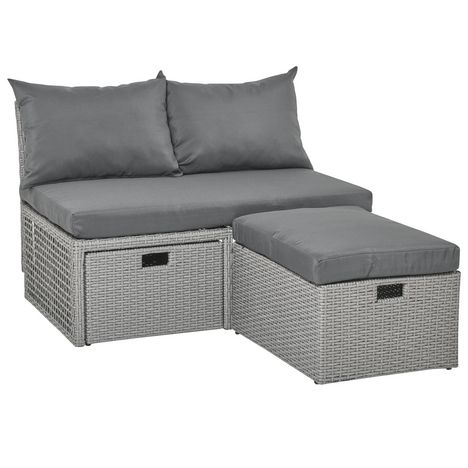En savoir +Ce magnifique ensemble salon de jardin 3 places 3 pièces composé d'un canapé 2 places, d'un pouf, d'un coffre de rangement (4 coussins inclus) sera très pratique et confortable pour un usage au quotidien. En effet, le pouf et coffre de rangement sont encastables sous le canapé ce qui vous permettra d'optimiser votre espace libre disponible.