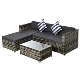 - Ensemble salon de jardin complet doté de 2 canapés d'angle (avec coussins), d'un canapé au milieu, d'un pouf et d'une table basse (avec plateau verre trempé)