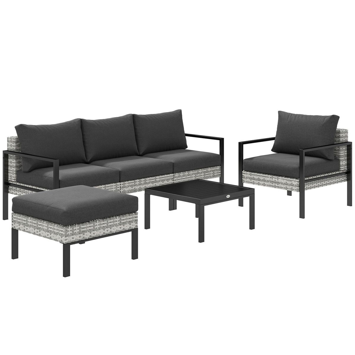 Aménagez un espace extérieur avec ce set de salon de balcon Outsunny incluant un fauteuil, deux chaises latérales, une chaise sans accoudoirs, un pouf et une table basse. Structure métallique robuste, revêtue de rotin plastique chic, ce salon bas de jardin extérieur est doté des coussins avec housse