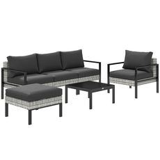 Ensemble salon de jardin 5 places 4 pièces coussins anthracite métal époxy noir résine tressée 2 fils gris