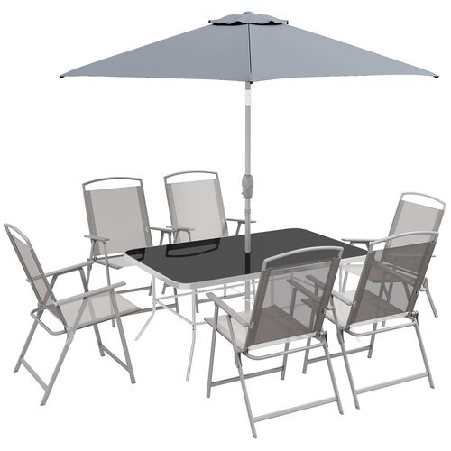 En savoir +L'ensemble de jardin extérieur 8 pièces Outsunny se compose d'une table avec un plateau en verre trempé, de 6 chaises pliantes et d'un parasol amovible. Le parasol s'ouvre et se ferme facilement à l'aide de la poignée et un bouton permet de régler l'inclinaison, vous permettant d'être toujours bien à l'abri du soleil. Cet ensemble de terrasse 6 personnes est le choix idéal pour se détendre à l'extérieur.