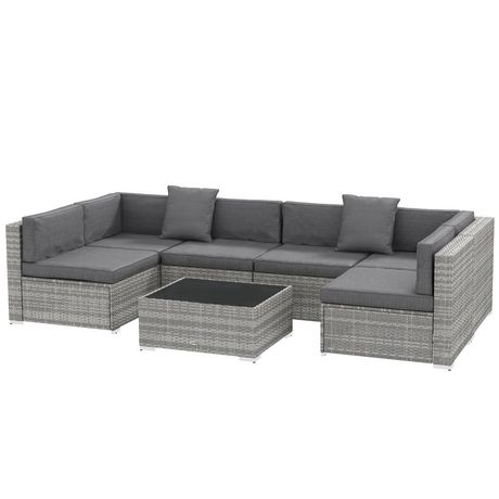 Ensemble salon de jardin 7 pièces modulables table basse plateau verre trempé coussins déhoussables inclus résine tressée imitation rotin gris