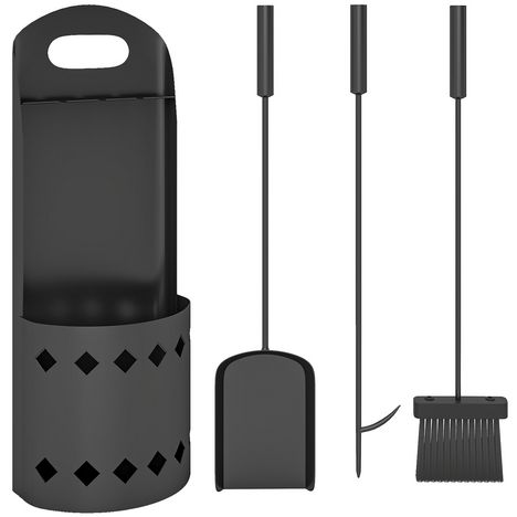 Ensemble serviteur de cheminée 4 pièces en métal - brosse, pelle, tisonnier - panier avec poignée inclus noir