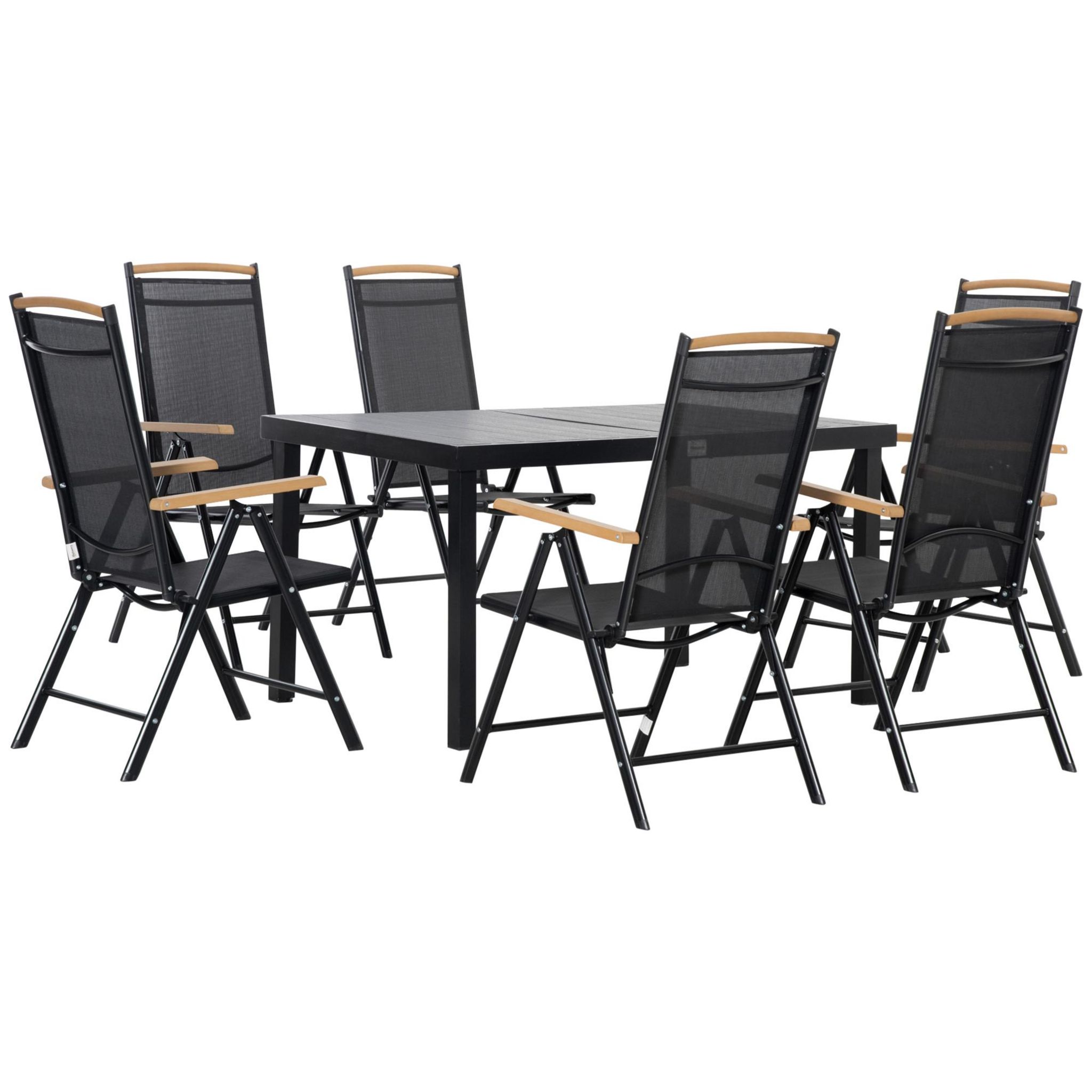 Ensemble table de jardin 6 personnes - chaises pliables inclinables accoudoirs - alu textilène noir plastique effet bois