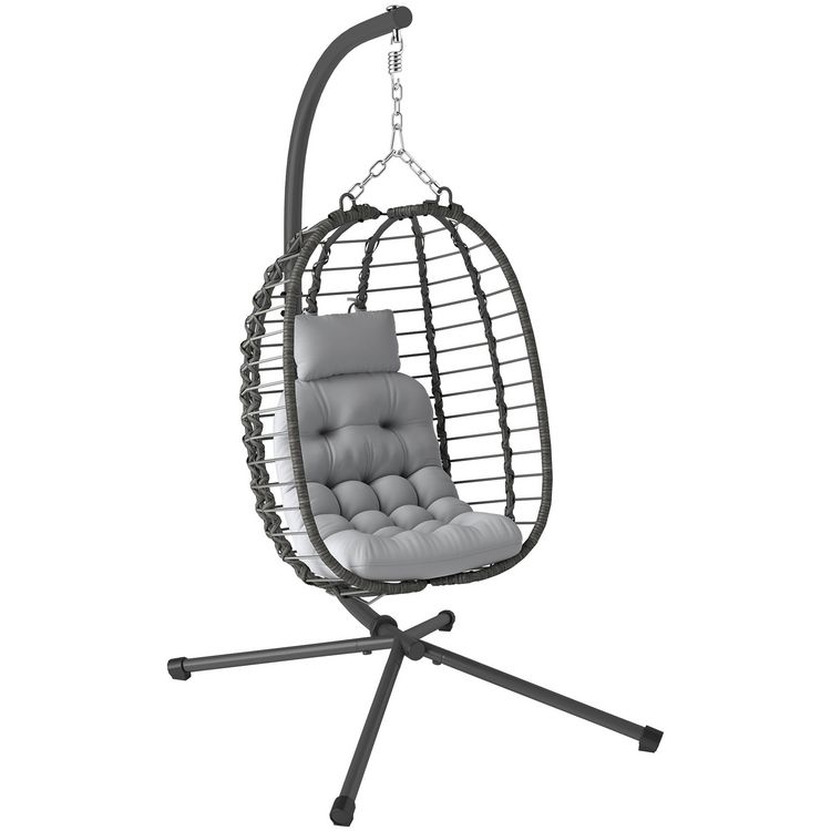 Fauteuil suspendu pliable en résine tressée avec support et épais coussin grand confort gris
