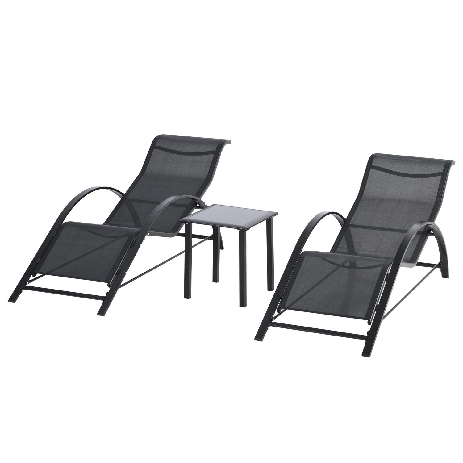 Lot de 2 bains de soleil design contemporain table basse plateau verre trempé métal époxy textilène noir