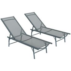 Détendez-vous avec l'ensemble de chaises longues pliantes Outsunny, ajustables sur cinq positions. Cadres en métal robuste, assise en maille fraîche, facile à transporter et ranger grâce aux pieds pliables. Idéal pour le soleil ou l'ombre. Prêt pour toute destination ensoleillée !