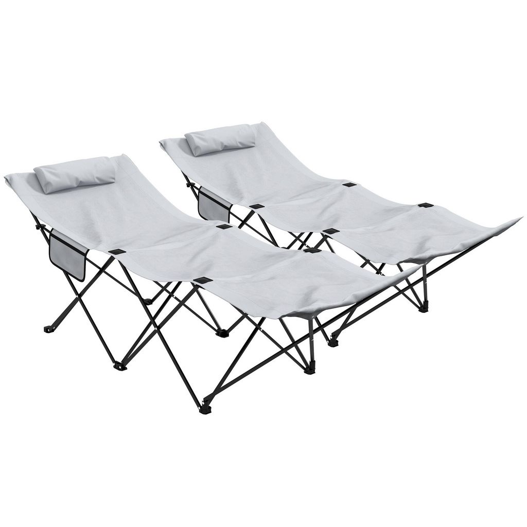 Lot de 2 bains de soleil transats pliables - poches latérales rangement, tétière - acier oxford gris