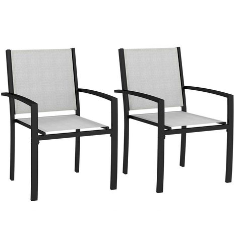 Lot de 2 chaises de jardin empilables avec accoudoirs acier noir textilène gris clair