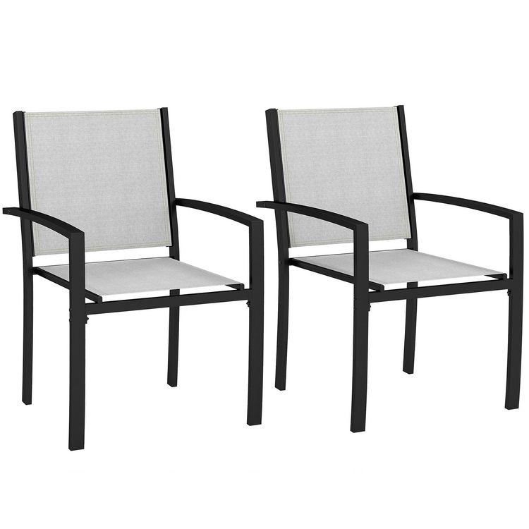 Apportez élégance avec le set de chaises de jardin Outsunny, empilable pour optimiser l'espace. Dossier et assise en textilène, idéal pour longs repas en extérieur. Cadre en acier à finition poudrée, ajoutant chic à chaque occasion.Caractéristiques :- Deux chaises de jardin incluses pour un confort