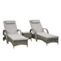 Lot de 2 transats bains de soleil grand confort : matelas, têtière, inclinaison réglable multipostions, accoudoirs, roulettes + table basse verre trempé résine tressée grise