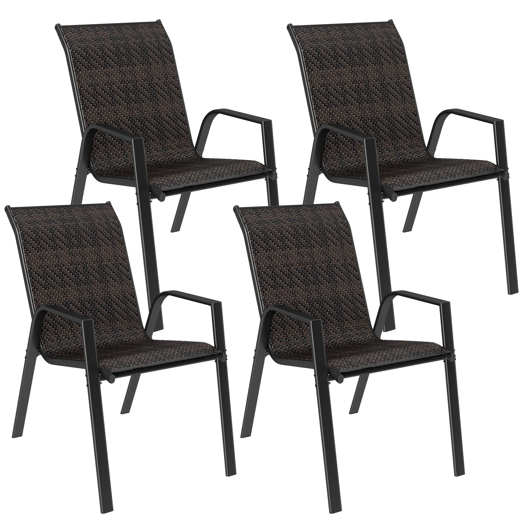Lot de 4 chaises de jardin empilables - accoudoirs - design - acier époxy noir résine tressée marron