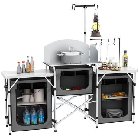 En savoir +Avec beaucoup d'espace pour votre matériel de cuisine, notre unité de cuisine de camping d'Outsunny fait le travail lorsque vous avez besoin de préparer des aliments en déplacement. La gestion de l'espace comprend trois plateaux de table, une étagère inférieure, trois armoires en tissu, quatre crochets et un support de lumière réglable en hauteur.