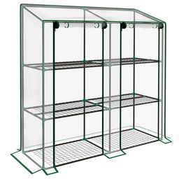 Outsunny propose une mini-serre avec un support de fleurs à trois niveaux qui offre une solution spacieuse pour les jardiniers de tous niveaux. La bâche en plastique avec deux portes enroulables crée une température et une humidité favorables à la croissance des plantes. Un toit en forme de pentagone empêche l'accumulation d'eau.