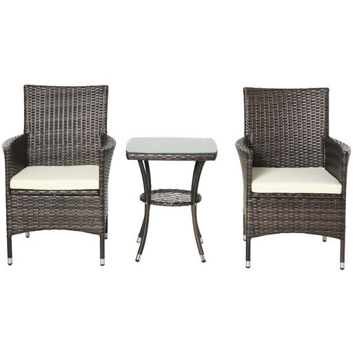 Outsunny Ensemble salon de jardin 2 places : 2 fauteuils et table basse plateau verre trempé résine tressée imitation rotin chocolat foncé coussins blanc