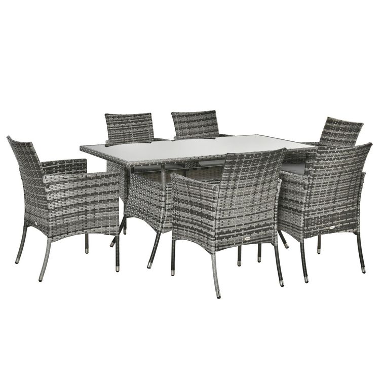 Outsunny Ensemble salon de jardin 6 personnes - grande table rectangulaire, 6 fauteuils - 6 coussins d'assise déhoussables inclus - métal époxy verre trempé 5 mm résine tressée grise